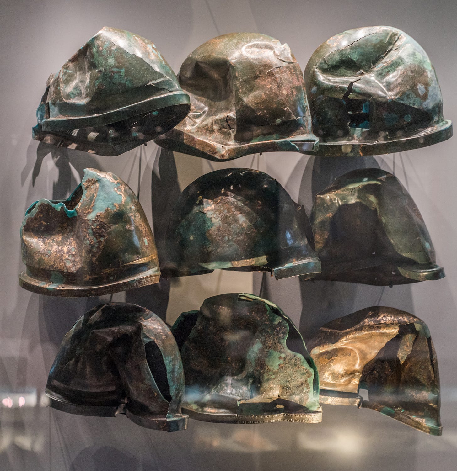 Below the dolium was a jumble of spear- and javelin heads (18 in total), two andirons for the roasting of meat, the fragments of bronze military belt and a Negau helmet. What are we to make of this? If the spears and javelins belonged to the Warrior, why were they not placed inside the coffin? Why was he not wearing the military belt? Why was the helmet not inside, or placed on top of, the coffin (cf. Montericco tomb 9)?